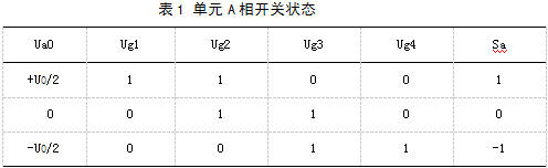 三電平電路,每一相橋臂4個開關(guān)元件有三種正常的開關(guān)模式。以A相為例:Ug1和Ug2導(dǎo)通時,A相輸出+U0/2;Ug2和Ug3導(dǎo)通時,A相輸出零電平;Ug3和Ug4導(dǎo)通時,A相輸出-U0/2。如果用Sa、Sb、Sc分別表示各橋臂的開關(guān)狀態(tài),每一橋臂都有三種開關(guān)狀態(tài),如表1所列。
