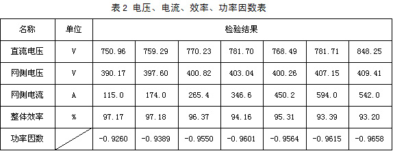 我公司做的大功率可再生能源回饋并網(wǎng)裝置經(jīng)鐵道部產(chǎn)品質(zhì)量監(jiān)督檢驗中心檢驗證明:具有輸出功率大、網(wǎng)側(cè)電流波形好、整體效率高等特點。表2是功率因數(shù)、直流側(cè)輸入電壓、網(wǎng)側(cè)交流電流及整體效率的簡表。