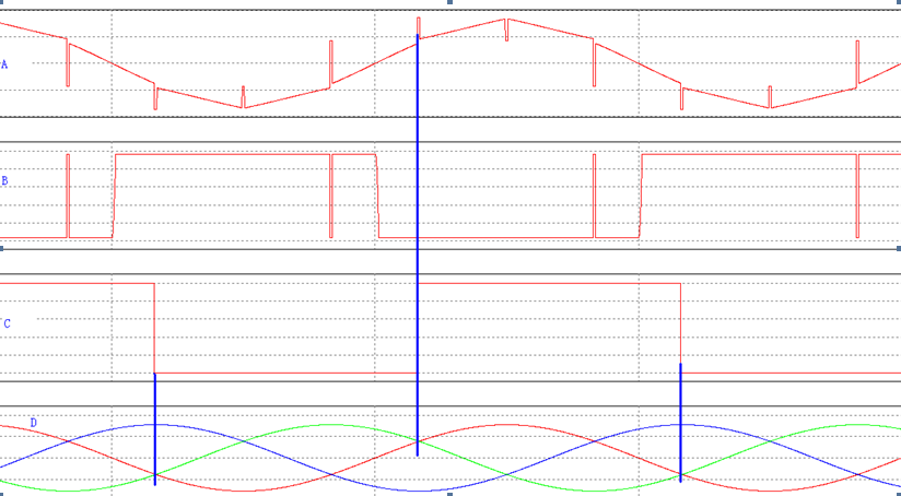 在這個電路中通過光耦TA、TB、TC的次級就可以獲取三相的過零信號,但在反向整流工作中仍然由于電源缺口在光耦次級會有比較窄的過零脈沖,但是完全可以通過CPLD適當?shù)奶幚砣サ簦鐖D3中的藍色,沒有經(jīng)過CPLD處理時獲取的信號: