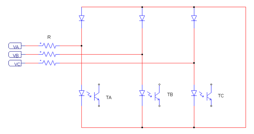 由于反向整流要求同步信號有比較高的對稱波形,上面的電路中只是取到了相電壓的大于零的部分,但由于光耦和二極管的壓降存在,可能會使得不對稱的情況產(chǎn)生,所以如果要正負半周對稱,可以考慮使用6個光耦來產(chǎn)生信號,如下圖: