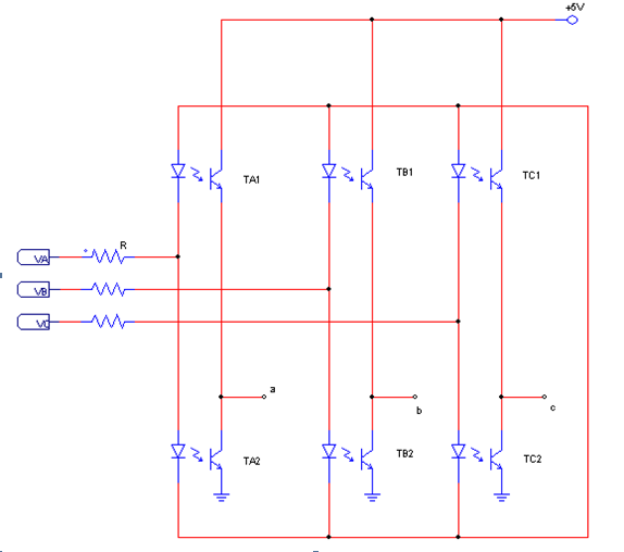 對于上述情況考慮采用光耦來獲取同步信號的過零點,這樣就可以不用考慮三相中點電位問題,又能夠獲取相電壓的過零點,初步方式如圖2所示: