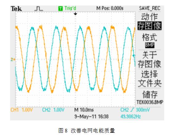 響應(yīng)速度小于5ms,對(duì)于電網(wǎng)電壓的跌落和閃變具有一定抑制作用并網(wǎng)波形(如圖8所示):