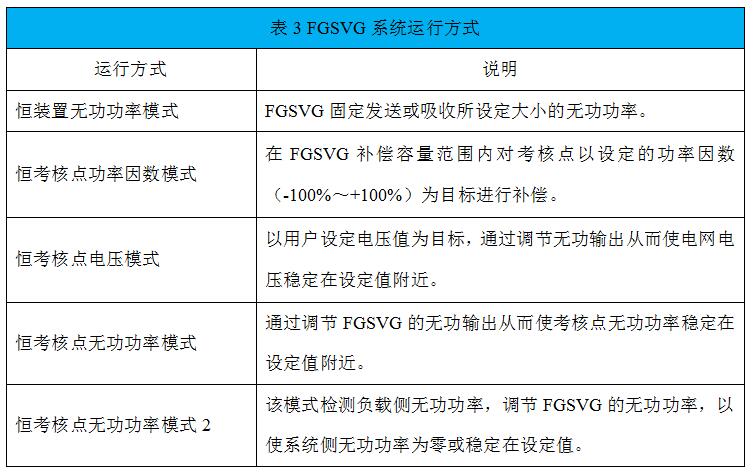 運(yùn)行方式包含了五種:恒裝置無功功率模式、恒考核點(diǎn)無功功率模式、恒考核點(diǎn)功率因數(shù)模式、恒考核點(diǎn)電壓模式、恒考核點(diǎn)無功功率模式2。由下拉框選定,并于右側(cè)設(shè)定目標(biāo)值,目標(biāo)值可隨時(shí)更改,更改后可根據(jù)檢測(cè)值檢查補(bǔ)償效果。如表3所示,對(duì)“運(yùn)行方式”進(jìn)行了詳細(xì)說明。