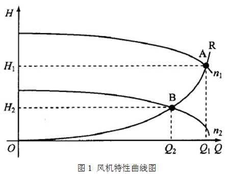 風(fēng)機(jī)特性如圖1所示。風(fēng)機(jī)工作在A點(diǎn)時(shí),其功率為PA=H1×Q1/102;風(fēng)機(jī)工作在B點(diǎn)時(shí),其功率為PB=H2×Q2/102。因Q2H1,故PA與為PB的值變化較大,說(shuō)明采用變工頻工作方式時(shí),改變風(fēng)機(jī)的風(fēng)量,風(fēng)機(jī)的軸功率減小很大,節(jié)能效果顯著。