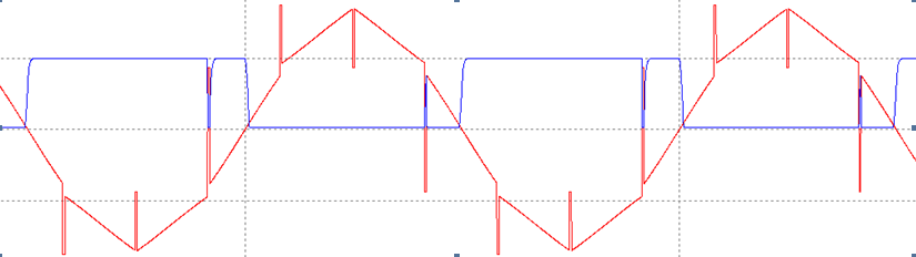 在這個電路中通過光耦TA、TB、TC的次級就可以獲取三相的過零信號,但在反向整流工作中仍然由于電源缺口在光耦次級會有比較窄的過零脈沖,但是完全可以通過CPLD適當?shù)奶幚砣サ簦鐖D3中的藍色,沒有經(jīng)過CPLD處理時獲取的信號:
