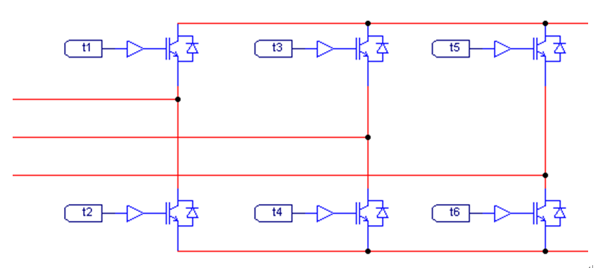 圖中t1\t2對應(yīng)A相,t3\t4對應(yīng)B相,t5\t6對應(yīng)C相,假設(shè)信號a\b\c進行濾波延時處理后的信號為A\B\C,則6個驅(qū)動信號的邏輯處理為:
