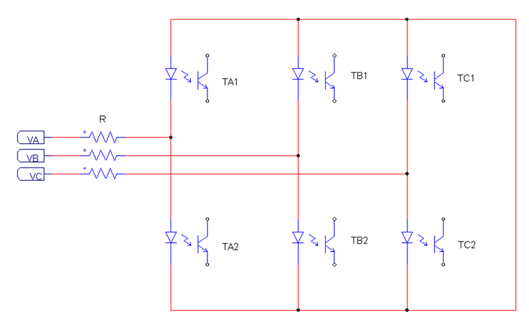 由于反向整流要求同步信號有比較高的對稱波形,上面的電路中只是取到了相電壓的大于零的部分,但由于光耦和二極管的壓降存在,可能會使得不對稱的情況產(chǎn)生,所以如果要正負半周對稱,可以考慮使用6個光耦來產(chǎn)生信號,如下圖: