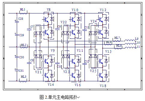系統(tǒng)包括主電路、檢測部分、控制部分。主電路的關(guān)鍵是開關(guān)元件IGBT,本部分的作用為完成電力的轉(zhuǎn)換,將直流電網(wǎng)富余的電能轉(zhuǎn)換為交流電并網(wǎng)。檢測部分主要由傳感器組成,其主要作用為檢測交流電網(wǎng)的電壓、電流、相位,檢測直流側(cè)的電壓、電流,并將檢測到的物理信號轉(zhuǎn)換為弱電信號,將其送入控制單元。控制單元的作用為根據(jù)傳感器輸入的信號和外部輸入的信號做出判斷,輸出PWM信號控制IGBT動作,使其完成電能的轉(zhuǎn)換;控制單元還具有輸入輸出的接口,接受外部指令信號,并將本系統(tǒng)的狀態(tài)傳給相關(guān)的系統(tǒng)。元件每個單元內(nèi)部采用三點平逆變結(jié)構(gòu)。圖紙幅度所限,在此只給出每個單元的主電路拓撲如圖2所示。采用電解電容作為逆變前的儲能元件,降低直流母線的電壓波動。主開關(guān)器件選用IGBT,輸出側(cè)使用電抗器濾波。核心控制芯片采用TI公司的TMS320LF2000系列的芯片,此系列的芯片是專門為電力電子轉(zhuǎn)換而設(shè)計的芯片,有豐富的片內(nèi)外設(shè)功能。包含有如下外設(shè):事件管理器:定時器和用于數(shù)字電機控制的PWM發(fā)生器;CAN接口