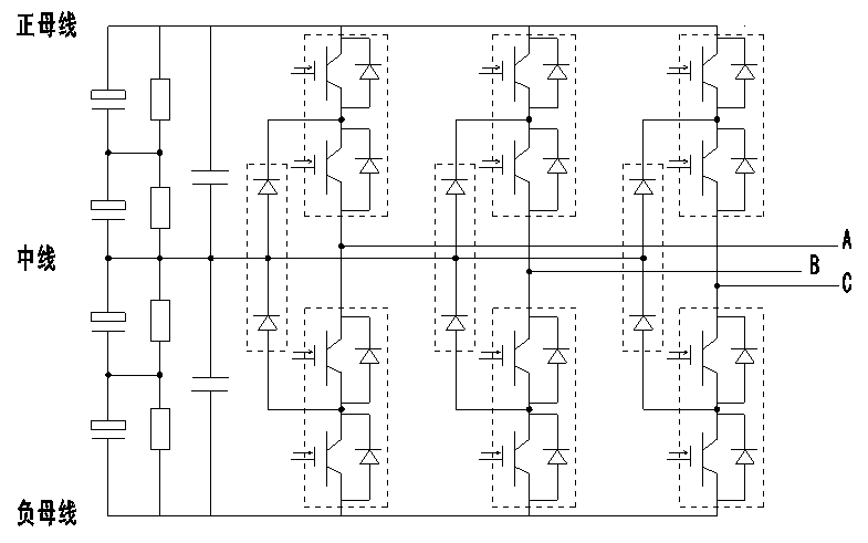逆變單元的主要作用是把系統(tǒng)瞬間剎車積聚的能量逆變成與電網(wǎng)電壓同步的交流電回送至電網(wǎng)。目前地鐵牽引供電系統(tǒng)電壓一般有兩個電壓等級即直流750V和1500V,逆變主電路采用二極管箝位三電平電路拓撲。主電路拓撲如圖3所示。