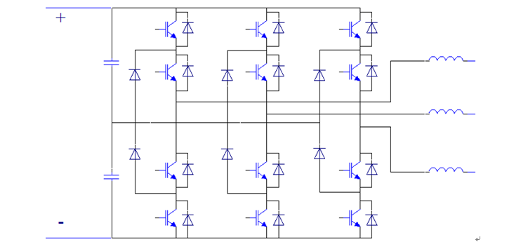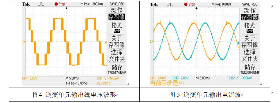 逆變裝置的單元采用三電平拓撲電路,如圖3所示。逆變輸出電壓波形、輸出電流波形分別如圖4、5所示。